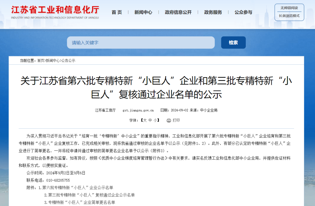 根據工(gōng)信部統一(yī)部署,江蘇省工(gōng)信廳于2024年(nián)9月(yuè)2日(rì)™發布了(le)《關于江蘇省第六批專精特新“小(xiǎo)巨人(rén)”企業(yè)和(hé)第三批專精特新“小(xiǎo)巨人(rén)”複核通(tōng)過企業(yè)名單的(de)公示》,其♠中江蘇曼荼羅軟件(jiàn)股份有(yǒu)限公司、丹陽慧創醫(yī)療設備有(yǒu)限公司、深圳市(shì)企企通(tōng)科(kē)技(jì) 有(yǒu)限公司等17家(jiā)創投集團被投企業(yè)入選第六批專精特新“小(xiǎo)巨人(rén)”企業(yè)≥。