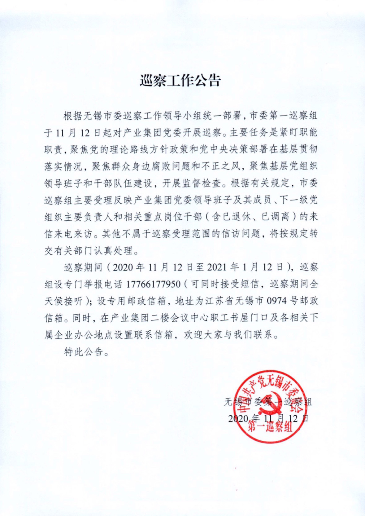 | 巡察工(gōng)作(zuò)公告 |