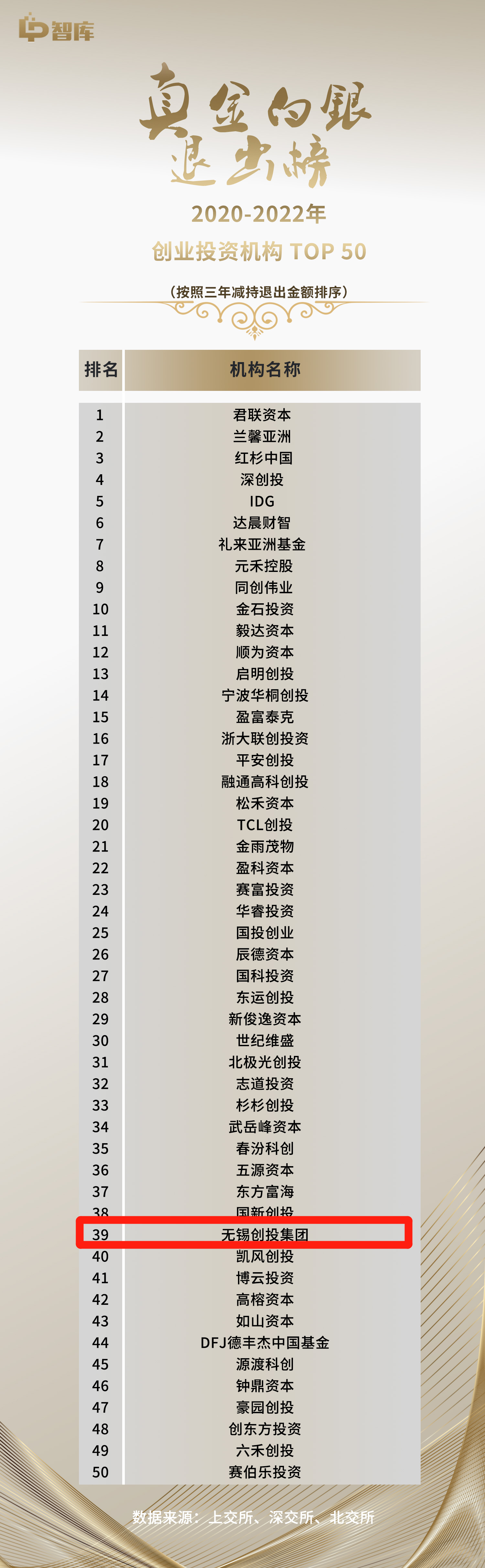 | 創投集團榮獲《真金(jīn)白(bái)銀(yín)退出榜》2020-2022年(nián)創業(yè)投資機(jī)構TOP50榜第39名 |